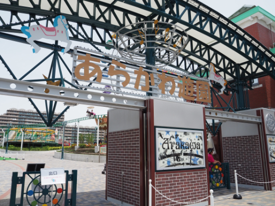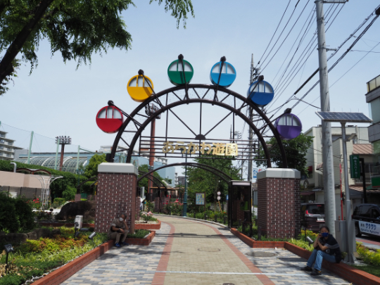 最寄りの都電荒川線(東京さくらトラム)「荒川遊園地前」駅下車し遊園地に向かう道には新しい観覧車を模したゲートが。