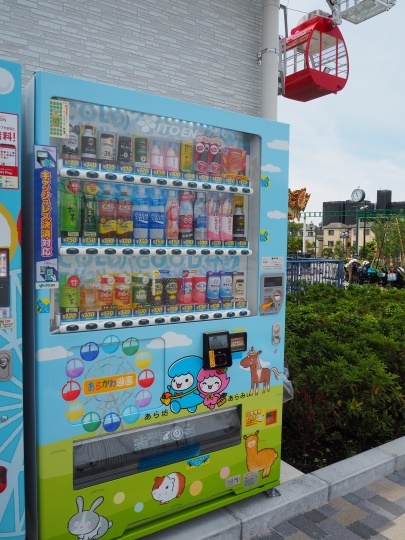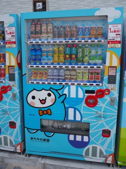 自動販売機にも、ちゃんと「あらかわ遊園」の色合いの看板つきのデフォルメされたイラストが。