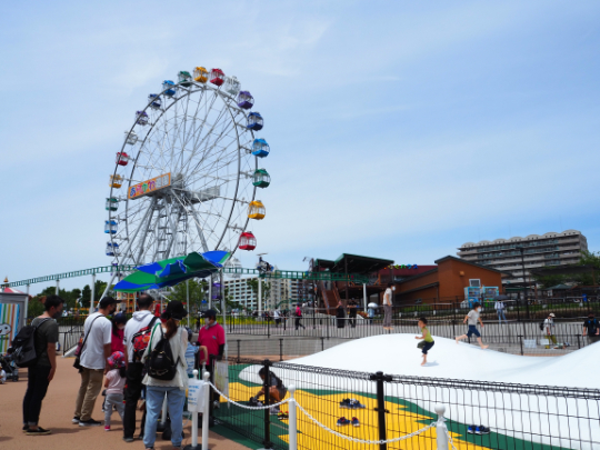 観覧車はリニューアル前と同じ園内の中心部に位置しており、ゲート外からも上半分が見える。